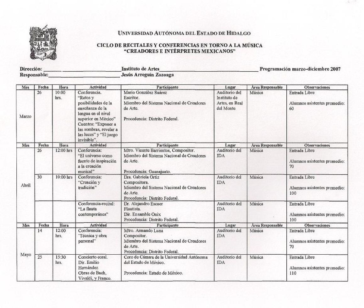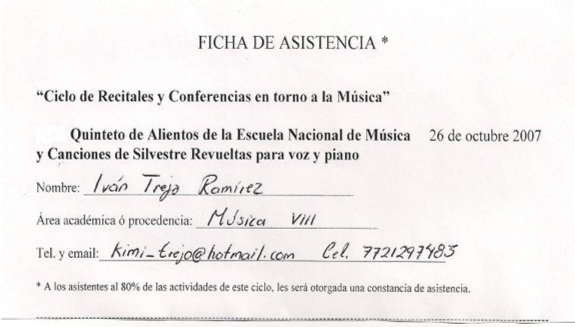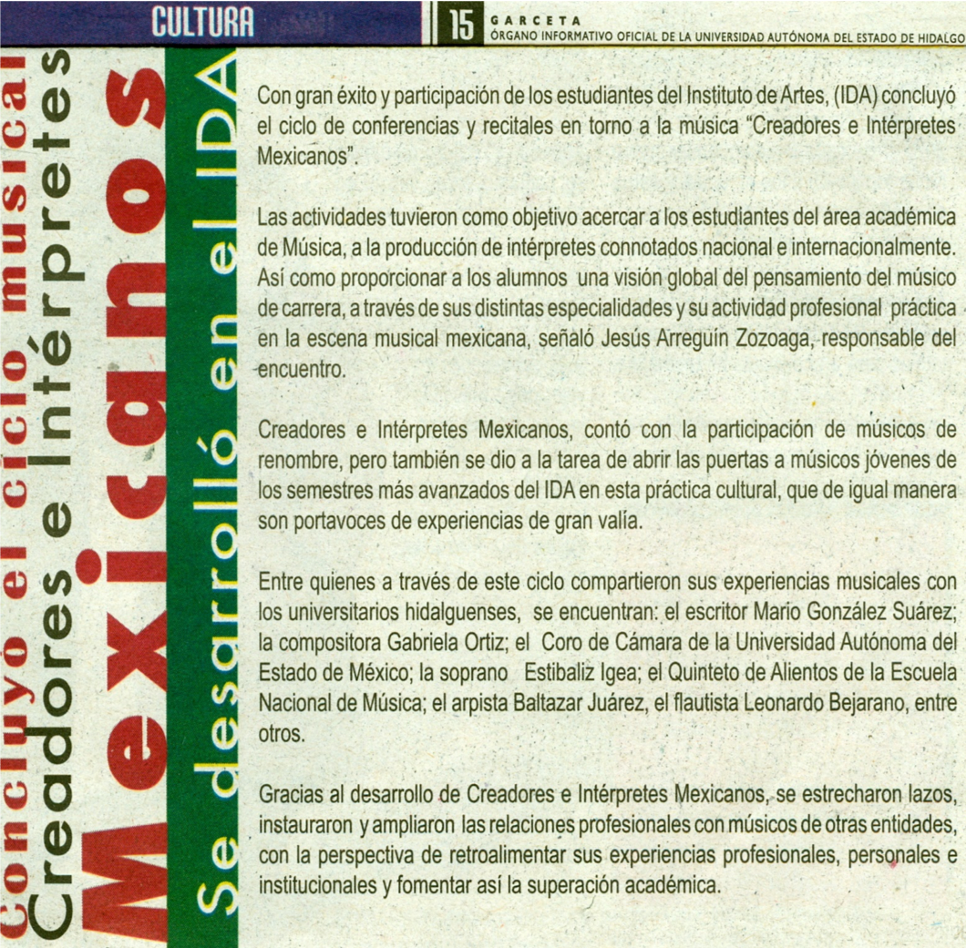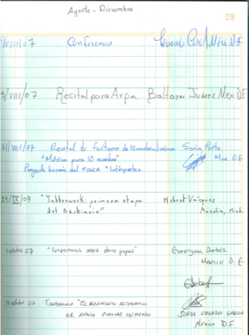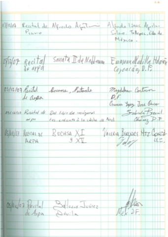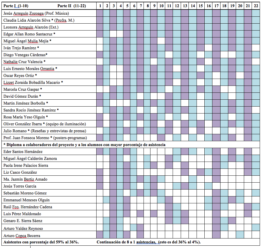 8● Hedy Munguía Elizalde, Yazmín Torres Zamora, Julio Cesar Cortez. 7● Héctor Javier Reyes Bonilla (Prof. M.), Marlín Torres Zamora, Juan Fco. Solís Rodríguez, Diego H. González Gómez, Alberto Pérez Fernández Madrid, Samuel Rico Pérez, Danáe García Escamilla, Italo González Aguilar. 6● Santana Salinas Galván, Luis A. Castro Mendoza, Cesar Cardoso Gallardo, Antar Ahumada Amador, Marilyn Skewes, Noel García San Juan, Oswaldo Olvera Gálvez, Miguel A. Hernández Larios. 5● Jesús Morales Castro, Asaél Guevara Flores, Valeria Ballesteros, José Luis Flores Mendieta, Enrique A. Lobera Jiménez, Christian Celaya Pérez, Jessica Daniela Trejo Zúñiga, Antonio E. Marrón, Miguel A. Moreno García, Joaquín Benítez Meza. 4● Luis González Gándara, David Baltasar Sánchez, Juan Heliodoro Gómez, Edgar Ulises Osorno, Rogelio García Lozano, José Alfredo Ángeles C., Alonso Ávila Jiménez, Margarita López Jiménez, Jovan Hernández Cruz, Fernando M. Jiménez Silva, Sergio Octavio Trejo (Escultor, publico externo), Elsa de Trejo (pub. ext.), Antonieta Trejo (ext.), 3● Marco Aurelio García (Prof. D.), Daniel Carretero Hernández, Judith A. Pérez Olalde, Jonatan Espíritu Torres, Felipe Mendoza Cruz, Julio Cesar González Mendoza, Israel Celedonio Moreno, Pedro Rosales Andrade, Héctor F. Ramírez Villegas, Lucero Anabel Ramírez Mendoza, Marcial Lucas Hernández, Sinuhé Obdet Herrera Cruz, Iván Aguilar Ángeles, Lizette Alicia García Sánchez, Fernando Rodríguez García, María Del Carmen Díaz, Irma E. Cruz Lara, Acompañante Valdez, Susana Mijangos (pub. ext.). 2● Rafaèl Oliva Parga (Prof. M.), Fernando Solís García, M. Elena Rivero Cajiga, Fredy Hernández Hdz, Aarón Monroy López, Acompañante Heliodoro Gómez, Fabián Romero Gómez (Lic. Inf. pub. ext.), Luz Elena León Bautista, Verónica Hernándz Hdz, Lucero Sosa Padilla, Rodrigo Morales Martínez, Gildardo Pérez Hernández, Alfredo García Jiménez, Argelia Pérez Santillán, Mónica Sánchez M. (Dte. M), Esmeralda Dolores M. (D.), Aly Casco González (A.D.), Marlene González Garnica (A. D.), Miguel Ledezma (Prof. A.V.), Kalahan Rojas (pub. ext.). 1● Yolotl Reyes Moreno (Profra. M.), Fernando Mejía (Prof. M.), J. Guadalupe Mercado (Prof. M.), Mauricio H. Monterrubio (Prof. M.), Carlos Marín Trigo (Prof. M.), Mónica Sánchez Mendoza (Prof. M.), Gloria L. Sotomayor Carrillo, Maricela Hernández Pliego, Toshiro Javier Pérez Serrano, Manuel A. Reynoso Zacarías, Eliseo Falcón Cruz, José Francisco De Lucio, Alfredo López Peñafiel, Homero García San Juan, Francisco Pérez Gómez, Fernando Alberto Sánchez H., Jimena G. Santillán, Arturo Álvarez García, Alfredo García Jiménez, Paulino Robles Monroy, Alberto González García, Guillermo E. Hernández Islas, Acompañante de Genaro Sierra, Diana Abigail Salazar, Julio Cesar Granados López, Francisco J. Enciso Reyes, Joel Peña Peña (Esc.Mus.Edo.Hgo. pub. ext.), Concepción Resendiz (Profra. A.D.), Eugenia Vargas (Profra. A.D.), Mirna Vargas (Profra. A.D.), Marisa Gómez (Profra. A.D.), Pavel Blancas (Prof. A.V.), Gabriela Portillo (Profra. A.V.), Jhon Lundberg (Prof. A.V.), Alicia Arizpe (Profra. A.V.), Julia Caporal (Profra. A.V.), Maribel Rojas (Profra. A.V.), Ana Mayoral (Profra. A.V.), Manuel Caballero (Prof. A.V.), Miguel Sánchez (Prof. A.V.), Verónica Ramírez (Profra. A.V.), Daoud Sarhandi (Prof. A.V.), Carolina Rivas (Profra. A.V.), Juan de Dios (Prof. A.V.) y asistente, Francisco Illescas (Prof. D.), Julio Oviedo (Prof. D.), Iván Carballo (Prof. D.), Israel Montaño (Prof. D.), Osvaldo Colín (Prof. D.), Jesús Mora, (Prof. D.) y esposa, Mtro. Alex Zybin y López, (Prof. D.), Mtra.Violet Zelich, (Profra. D.), Ma. Rosa Gómez Q. (Profra. D.), Dr. Saturnino Martínez (pub. ext.), Demetrio Ordaz (pub. ext.), Fabiola Monroy (pub. ext.), Enrique del Castillo (IMJUVE) y asistente, Mtro. Guillermo Cuevas, Priscila Moctezuma (A.D.), Amisadaí Fabela Romero (A.D.), Abigail Montelongo Cruz (A.D.), Arlette Guajardo Oteo (A.D.), Susana García Morales (A.D.), Cristina López León (A.D.), Karen Tiburcio García (A.V.), Rogelio Gómez Jiménez (A.V), Ricardo Salgado López (¿?), Mario Maldonado Reyes (A.V), David Gómez Tejeda (pub. ext.), Adriana Martínez Aguilar (D.), Nubia Nallely Abreu (D), Eva Doni Salazar Popoca (D.), Antonio de Jesús Álvarez (D.), Cesar Blancas Ramírez (A.V.), Román Calva (A.D.), Sharim Padilla (A.D), Julisa Yadira Labastida (D.), Rocío Zepeda Muñoz (D.), José A. Sánchez Arroyo (D.), Arturo Rojas (pub. ext.), Jorge Shaffer Rivero (H.E.N.M. pub. ext.), Eréndira Leal (Veterinaria y Zootec.), Carlos Iván Cruz (A.D.), Francisco Arrieta (A.D.), Emmanuel Papadopulos, Karin Merk, Andrés Alberti, Acompañante de Alberti, Norberto, Anahid Baizabal, Juana Y. Espinoza, Beatriz López, Olga Castillo, Miguel A. Castillo, Alejandra Aparicio (D.), Javier Santo (D.), Siboney, Fátima, Susana, Mónica, Vania, Celene, Abigail, Alberto, Sara, Almendra, Wallis, Yadira, Alba, Laura L., Luis, Jessica, Copone, Jazmín, Mawe, Angélica, Julisa, Jaqueline, Juan, Adriana, Eloísa Castro (A.V.) y compañía, Jessica R., Roció Verano, Lenin, Hans Camacho, Keyla Vargas, Zait Basilio, Raúl Jiménez, Alett Aguilar, Ricardo Salgado, Abimael Rodríguez, Diana González, Diana Téllez, Farois, Schmelibeth y Priscila.