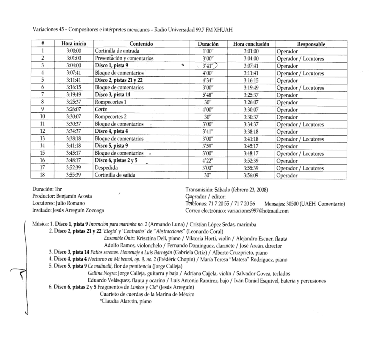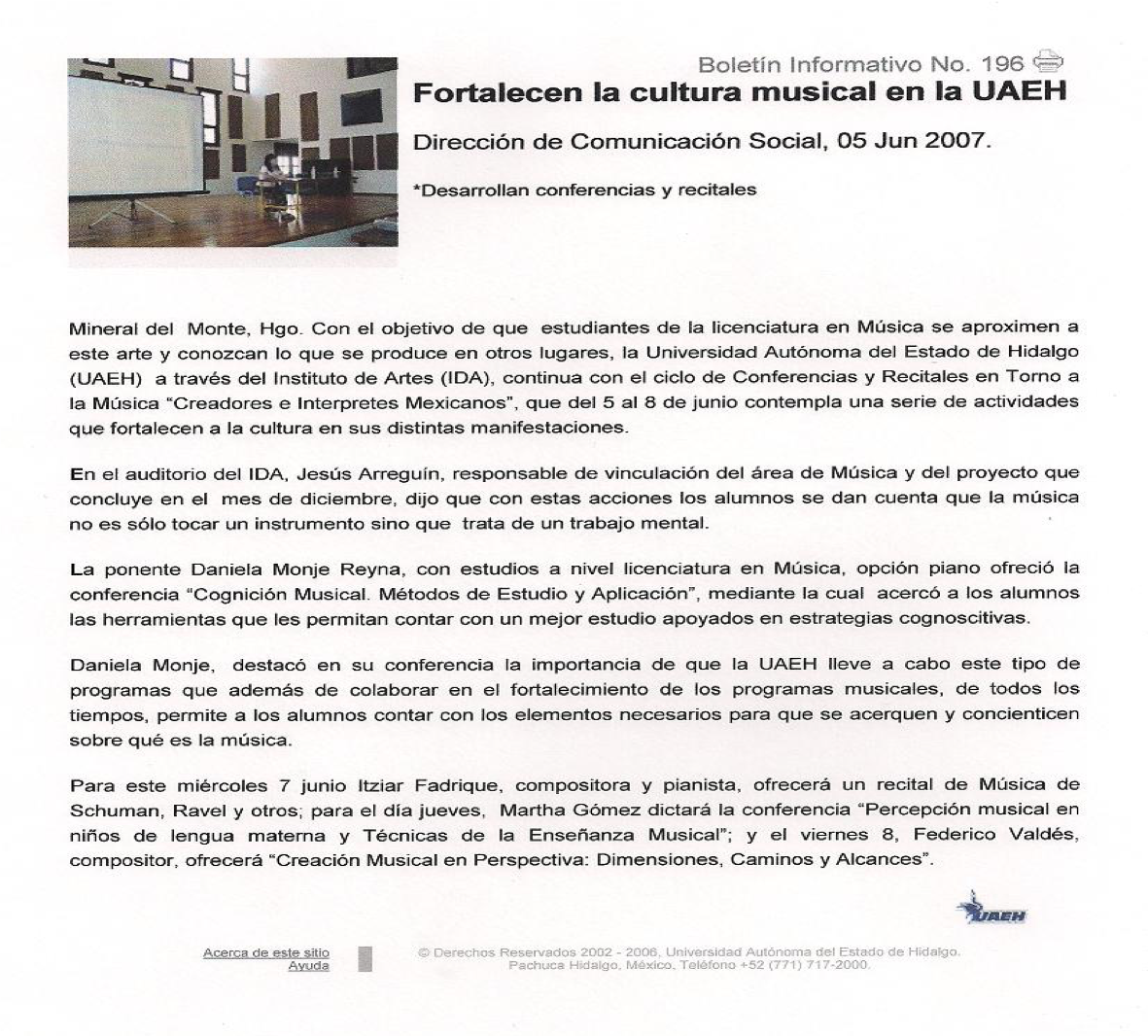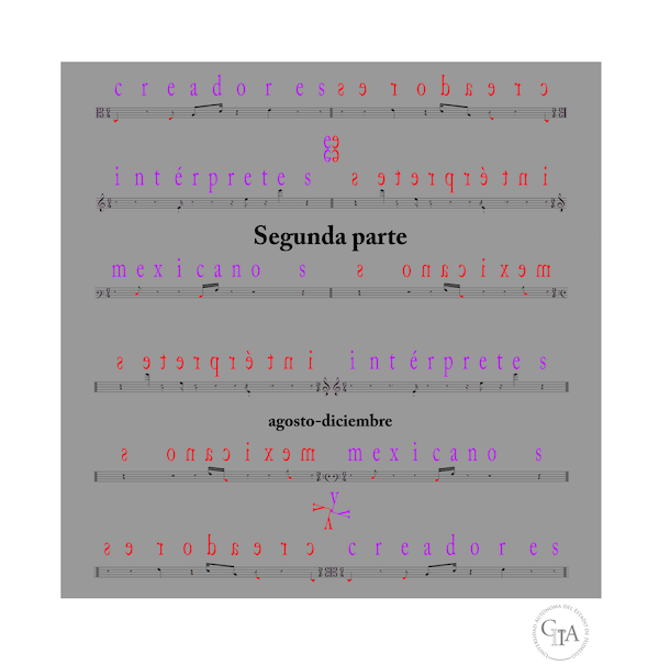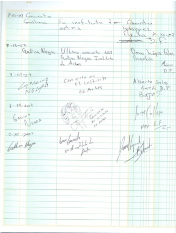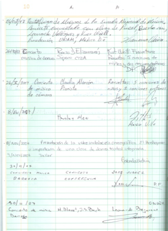 8● Hedy Munguía Elizalde, Yazmín Torres Zamora, Julio Cesar Cortez. 7● Héctor Javier Reyes Bonilla (Prof. M.), Marlín Torres Zamora, Juan Fco. Solís Rodríguez, Diego H. González Gómez, Alberto Pérez Fernández Madrid, Samuel Rico Pérez, Danáe García Escamilla, Italo González Aguilar. 6● Santana Salinas Galván, Luis A. Castro Mendoza, Cesar Cardoso Gallardo, Antar Ahumada Amador, Marilyn Skewes, Noel García San Juan, Oswaldo Olvera Gálvez, Miguel A. Hernández Larios. 5● Jesús Morales Castro, Asaél Guevara Flores, Valeria Ballesteros, José Luis Flores Mendieta, Enrique A. Lobera Jiménez, Christian Celaya Pérez, Jessica Daniela Trejo Zúñiga, Antonio E. Marrón, Miguel A. Moreno García, Joaquín Benítez Meza. 4● Luis González Gándara, David Baltasar Sánchez, Juan Heliodoro Gómez, Edgar Ulises Osorno, Rogelio García Lozano, José Alfredo Ángeles C., Alonso Ávila Jiménez, Margarita López Jiménez, Jovan Hernández Cruz, Fernando M. Jiménez Silva, Sergio Octavio Trejo (Escultor, publico externo), Elsa de Trejo (pub. ext.), Antonieta Trejo (ext.), 3● Marco Aurelio García (Prof. D.), Daniel Carretero Hernández, Judith A. Pérez Olalde, Jonatan Espíritu Torres, Felipe Mendoza Cruz, Julio Cesar González Mendoza, Israel Celedonio Moreno, Pedro Rosales Andrade, Héctor F. Ramírez Villegas, Lucero Anabel Ramírez Mendoza, Marcial Lucas Hernández, Sinuhé Obdet Herrera Cruz, Iván Aguilar Ángeles, Lizette Alicia García Sánchez, Fernando Rodríguez García, María Del Carmen Díaz, Irma E. Cruz Lara, Acompañante Valdez, Susana Mijangos (pub. ext.). 2● Rafaèl Oliva Parga (Prof. M.), Fernando Solís García, M. Elena Rivero Cajiga, Fredy Hernández Hdz, Aarón Monroy López, Acompañante Heliodoro Gómez, Fabián Romero Gómez (Lic. Inf. pub. ext.), Luz Elena León Bautista, Verónica Hernándz Hdz, Lucero Sosa Padilla, Rodrigo Morales Martínez, Gildardo Pérez Hernández, Alfredo García Jiménez, Argelia Pérez Santillán, Mónica Sánchez M. (Dte. M), Esmeralda Dolores M. (D.), Aly Casco González (A.D.), Marlene González Garnica (A. D.), Miguel Ledezma (Prof. A.V.), Kalahan Rojas (pub. ext.). 1● Yolotl Reyes Moreno (Profra. M.), Fernando Mejía (Prof. M.), J. Guadalupe Mercado (Prof. M.), Mauricio H. Monterrubio (Prof. M.), Carlos Marín Trigo (Prof. M.), Mónica Sánchez Mendoza (Prof. M.), Gloria L. Sotomayor Carrillo, Maricela Hernández Pliego, Toshiro Javier Pérez Serrano, Manuel A. Reynoso Zacarías, Eliseo Falcón Cruz, José Francisco De Lucio, Alfredo López Peñafiel, Homero García San Juan, Francisco Pérez Gómez, Fernando Alberto Sánchez H., Jimena G. Santillán, Arturo Álvarez García, Alfredo García Jiménez, Paulino Robles Monroy, Alberto González García, Guillermo E. Hernández Islas, Acompañante de Genaro Sierra, Diana Abigail Salazar, Julio Cesar Granados López, Francisco J. Enciso Reyes, Joel Peña Peña (Esc.Mus.Edo.Hgo. pub. ext.), Concepción Resendiz (Profra. A.D.), Eugenia Vargas (Profra. A.D.), Mirna Vargas (Profra. A.D.), Marisa Gómez (Profra. A.D.), Pavel Blancas (Prof. A.V.), Gabriela Portillo (Profra. A.V.), Jhon Lundberg (Prof. A.V.), Alicia Arizpe (Profra. A.V.), Julia Caporal (Profra. A.V.), Maribel Rojas (Profra. A.V.), Ana Mayoral (Profra. A.V.), Manuel Caballero (Prof. A.V.), Miguel Sánchez (Prof. A.V.), Verónica Ramírez (Profra. A.V.), Daoud Sarhandi (Prof. A.V.), Carolina Rivas (Profra. A.V.), Juan de Dios (Prof. A.V.) y asistente, Francisco Illescas (Prof. D.), Julio Oviedo (Prof. D.), Iván Carballo (Prof. D.), Israel Montaño (Prof. D.), Osvaldo Colín (Prof. D.), Jesús Mora, (Prof. D.) y esposa, Mtro. Alex Zybin y López, (Prof. D.), Mtra.Violet Zelich, (Profra. D.), Ma. Rosa Gómez Q. (Profra. D.), Dr. Saturnino Martínez (pub. ext.), Demetrio Ordaz (pub. ext.), Fabiola Monroy (pub. ext.), Enrique del Castillo (IMJUVE) y asistente, Mtro. Guillermo Cuevas, Priscila Moctezuma (A.D.), Amisadaí Fabela Romero (A.D.), Abigail Montelongo Cruz (A.D.), Arlette Guajardo Oteo (A.D.), Susana García Morales (A.D.), Cristina López León (A.D.), Karen Tiburcio García (A.V.), Rogelio Gómez Jiménez (A.V), Ricardo Salgado López (¿?), Mario Maldonado Reyes (A.V), David Gómez Tejeda (pub. ext.), Adriana Martínez Aguilar (D.), Nubia Nallely Abreu (D), Eva Doni Salazar Popoca (D.), Antonio de Jesús Álvarez (D.), Cesar Blancas Ramírez (A.V.), Román Calva (A.D.), Sharim Padilla (A.D), Julisa Yadira Labastida (D.), Rocío Zepeda Muñoz (D.), José A. Sánchez Arroyo (D.), Arturo Rojas (pub. ext.), Jorge Shaffer Rivero (H.E.N.M. pub. ext.), Eréndira Leal (Veterinaria y Zootec.), Carlos Iván Cruz (A.D.), Francisco Arrieta (A.D.), Emmanuel Papadopulos, Karin Merk, Andrés Alberti, Acompañante de Alberti, Norberto, Anahid Baizabal, Juana Y. Espinoza, Beatriz López, Olga Castillo, Miguel A. Castillo, Alejandra Aparicio (D.), Javier Santo (D.), Siboney, Fátima, Susana, Mónica, Vania, Celene, Abigail, Alberto, Sara, Almendra, Wallis, Yadira, Alba, Laura L., Luis, Jessica, Copone, Jazmín, Mawe, Angélica, Julisa, Jaqueline, Juan, Adriana, Eloísa Castro (A.V.) y compañía, Jessica R., Roció Verano, Lenin, Hans Camacho, Keyla Vargas, Zait Basilio, Raúl Jiménez, Alett Aguilar, Ricardo Salgado, Abimael Rodríguez, Diana González, Diana Téllez, Farois, Schmelibeth y Priscila.