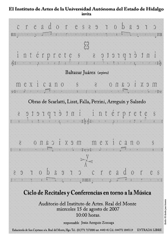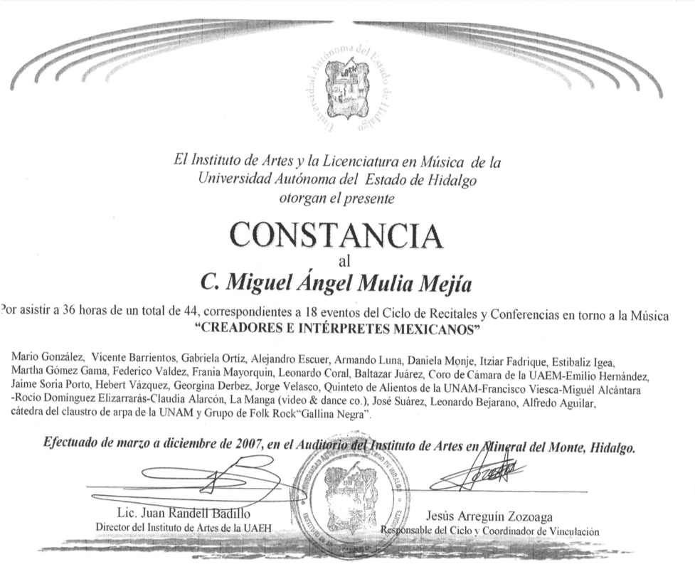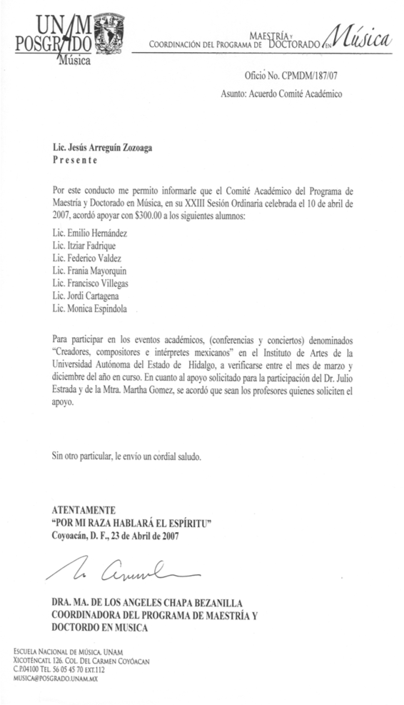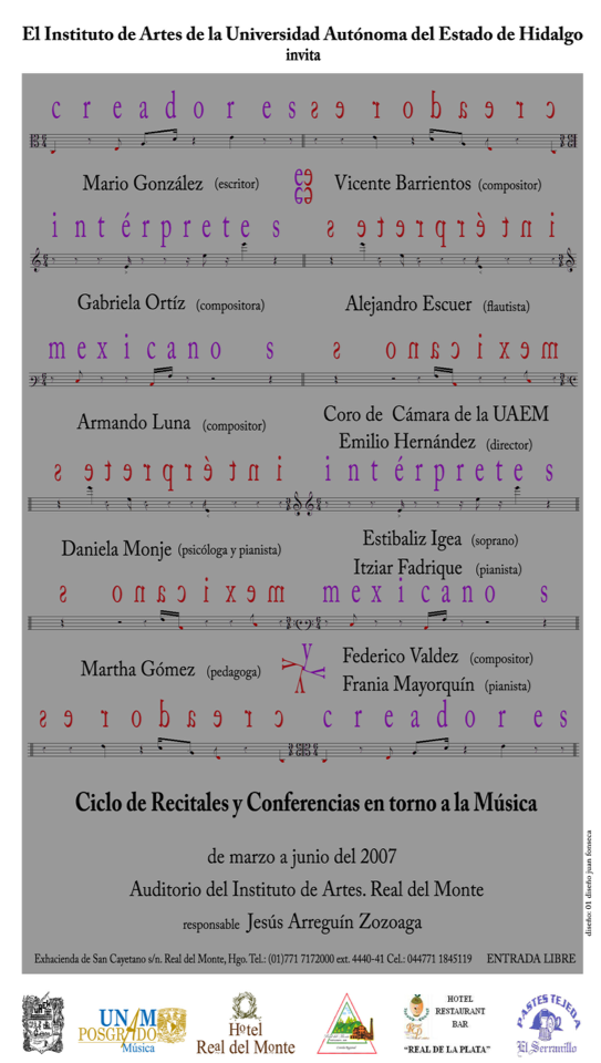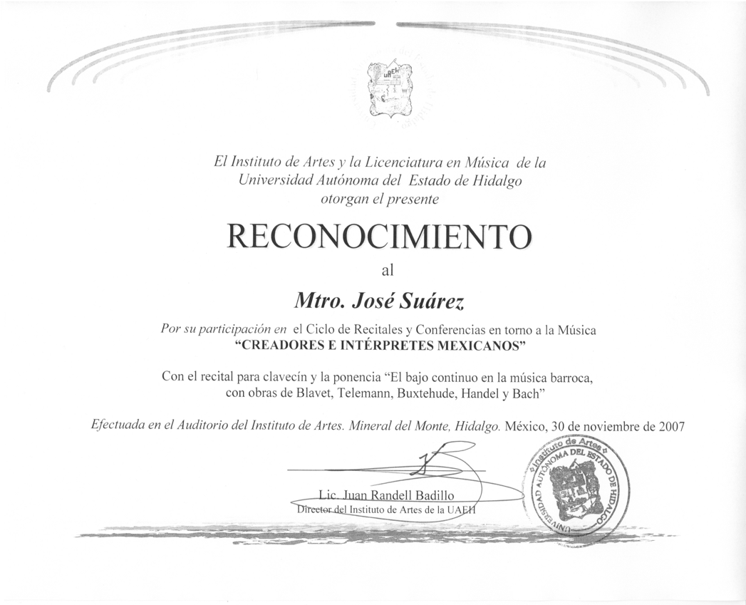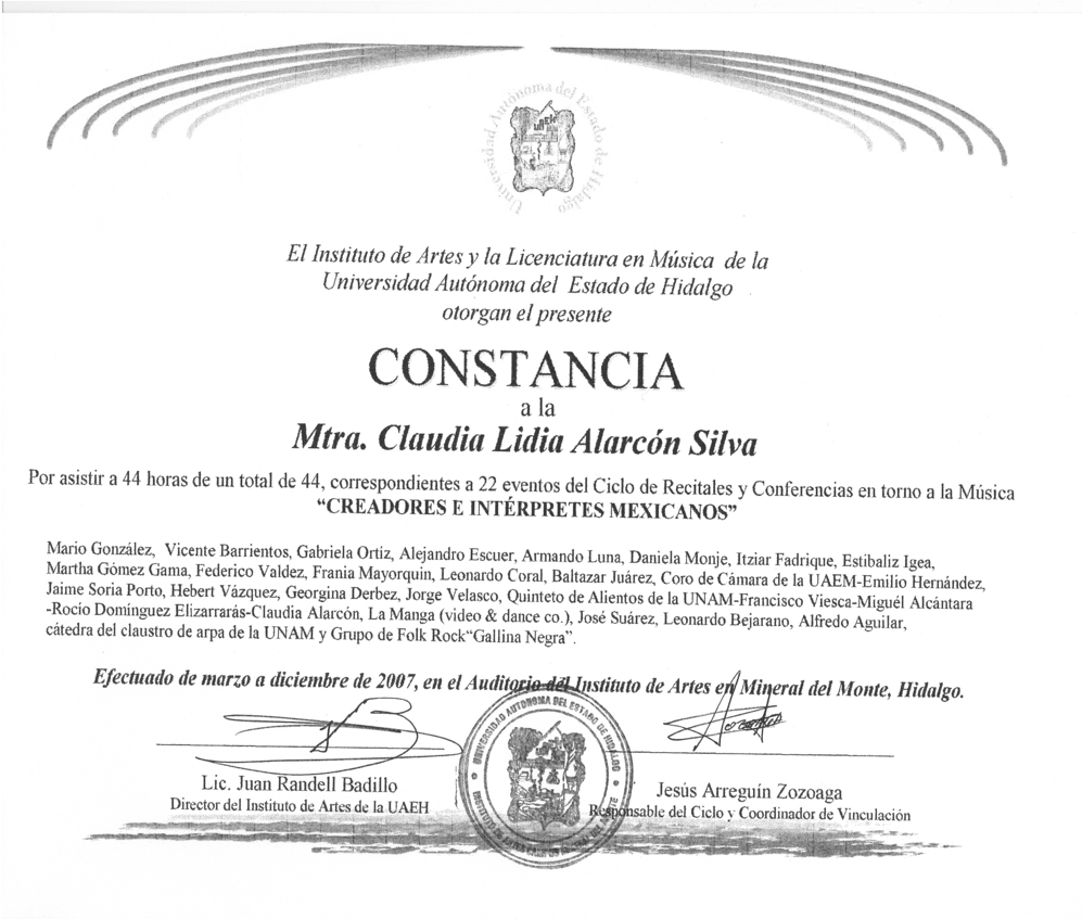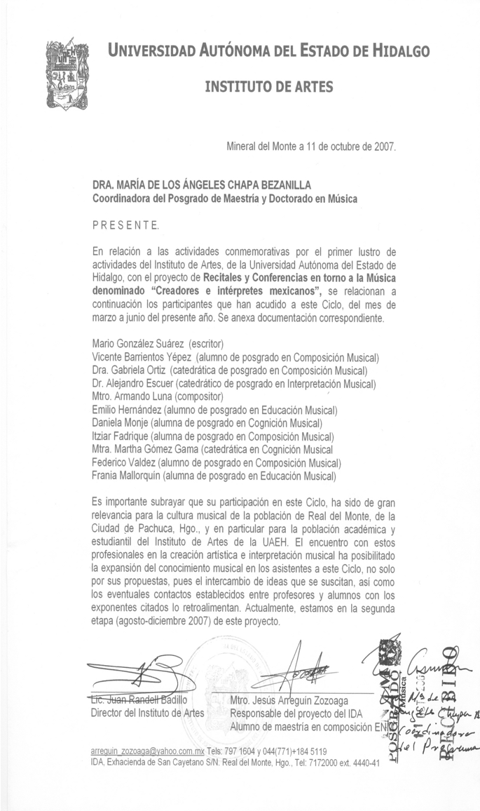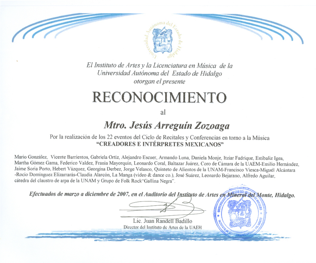 Al Lic. Juan Randell Badillo, Director del IDA y al Secretario Académico Mtro. Tomas Herrera, constantes asistentes al Ciclo, se les agradece la presentación que hicieron de los músicos y conferencistas a lo largo de todo el Ciclo de Recitales y Conferencias en torno a la Música, Creadores e Intérpretes Mexicanos.