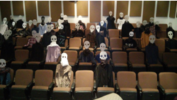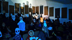 La primera actividad a cargo del grupo completo de Dibujo I, se desarrolla en el área de butacas del Auditorio -fundamentalmente en las butacas de la planta baja- a partir de una Intervención, recreando el ambiente o atmósfera mortuoria con calaveras fantasmales, espectros o ánimas. En la parte alta de la gradería sólo se colocan algunas figuras en el límite del balcón, pues es área destinada al trabajo de dibujo digital y a su proyección, como segunda actividad a cargo de los chicos de Artes Visuales.