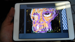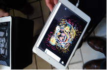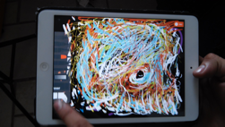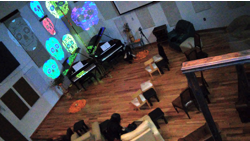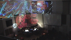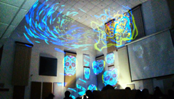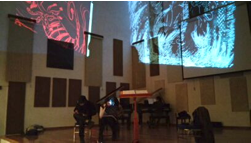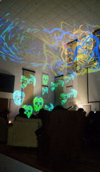 La participación de las Artes Visuales se dividió en dos partes, una Intervención del espacio de las butacas para el público, y la interacción en tiempo real (durante el recital), a partir de la proyección de líneas de colores, dibujos y mapping, desde tabletas digitales sobre los muros, techo y músicos.