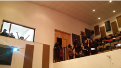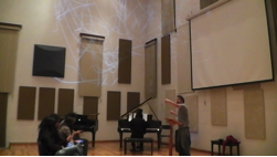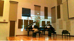 3. Revisión de la sincronía entre sonido y trazo en ensayos con un pianista y parte orquestal virtual en audio, mediante un proyector como receptor y emisor de las tabletas (Ipad), en el Auditorio.