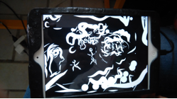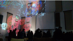 Proyección de imágenes en los muros desde la gradería (alumnos de 1er semestre de Dibujo I): Alma Alicia Aguilar Guerrero, Carolina Guiragossian Cuca, Esteban Miguel Muñoz Martínez, Javier Alejandro Macías Romero, Javier Emiliano Guzmán Trujillo, María Fernanda Cruz López, Maynor Islas López, Nohemí Amaranta García Flores, Tania Cruz Díaz, Víctor Manuel Martínez Martínez y Xchel Carmona López.
