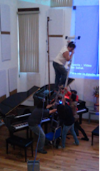 2. Ensayos en aula estrecha, poco propicios para conectar la tableta al monitor de un CPU y comprobar la sincronía entre el trazo de los alumnos y la guía musical del director.